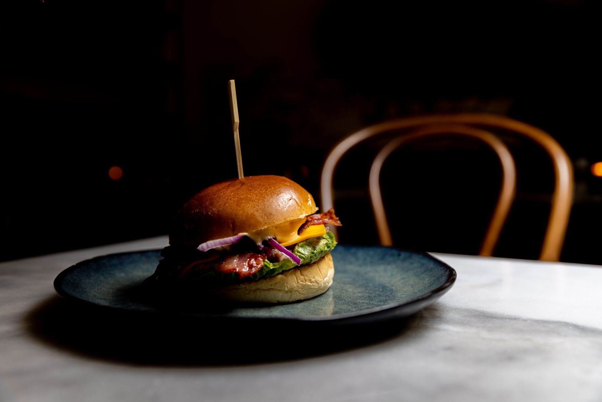 Cheddar, sla, tomaat, rode ui, bacon & Lou’s special burgersaus