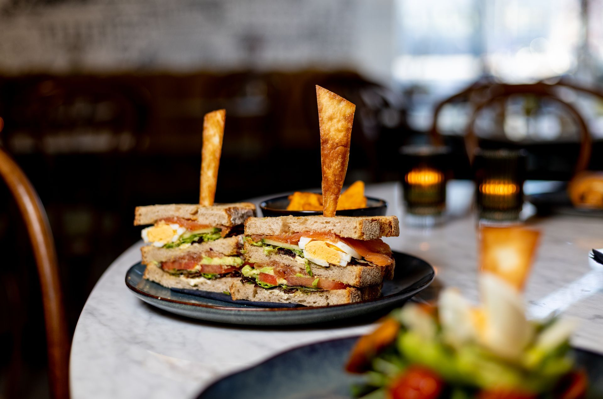 Little gem, gerookte zalm, avocado, gepocheerd ei, zongedroogde tomaat & Parmezaanse kaas